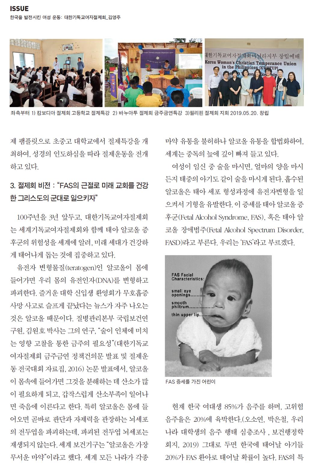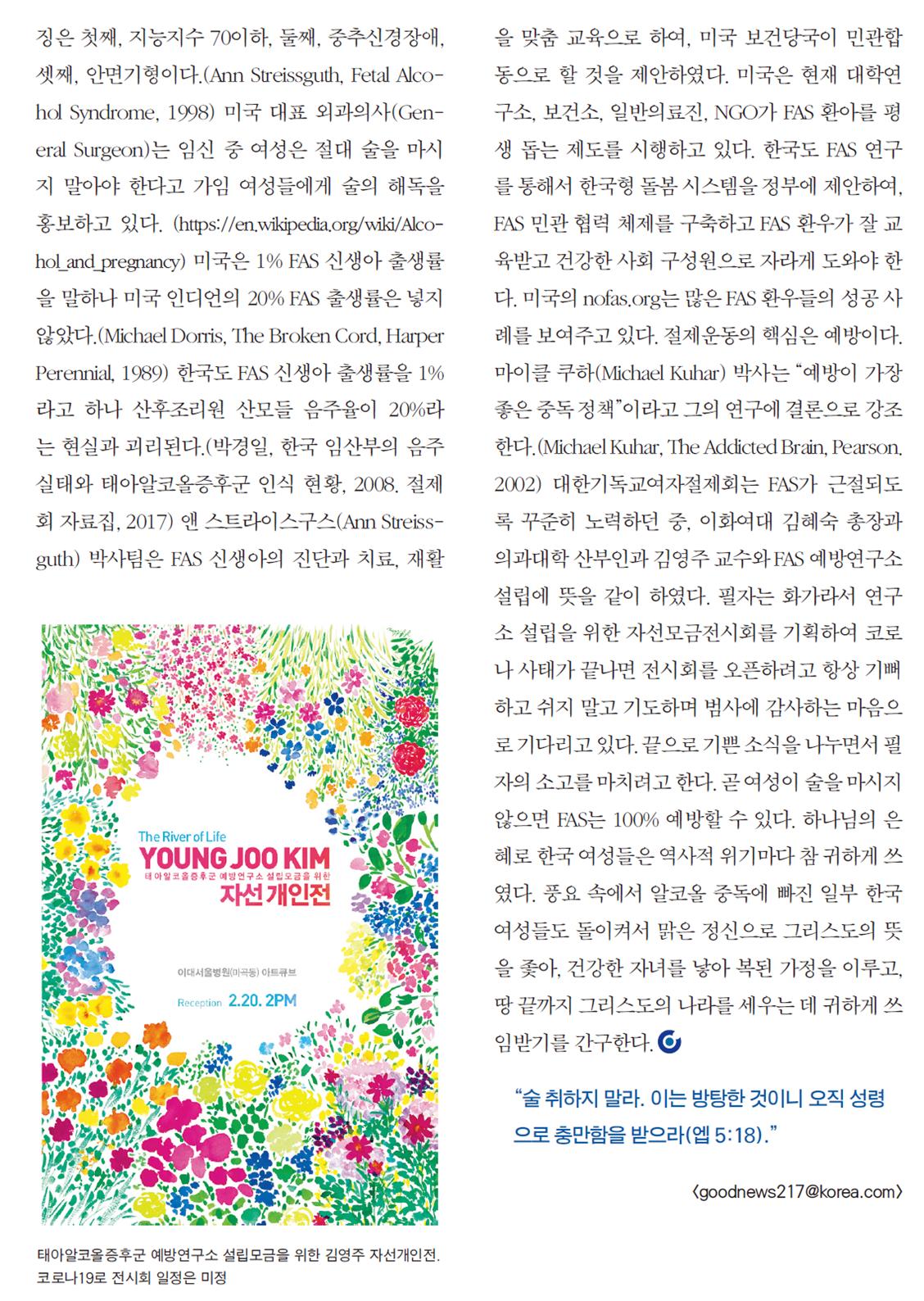 - Fetal Alcohol Syndrome 번역본을 펴내면서 술 취하지 말라 이는 방탕한 것이니 오직 성령으로 충만함을 받으라 (에베소서 5:18) 1995년 오스트레일리아에서 개최된 제33차 세계기독교여자절제회 세계대회 주강사, 앤 스트라이스구스는 태아알코올증후군 (Fetal Alcohol Syndrome, FAS)을 가지고 태어난 신생아가 살아가면서 겪을 고통을 나누면서, 예방을 위해 여성은 임신 중 꼭 금주해야 한다고 했다 (https://www.washington.edu/alumni/columns/june97/str...